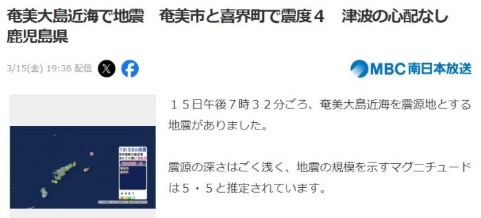 中新網(wǎng)3月15日電 據(jù)“南日本放送”消息,當(dāng)?shù)貢r間3月15日19時32分,日本奄美大島近海發(fā)生5.5級地震。