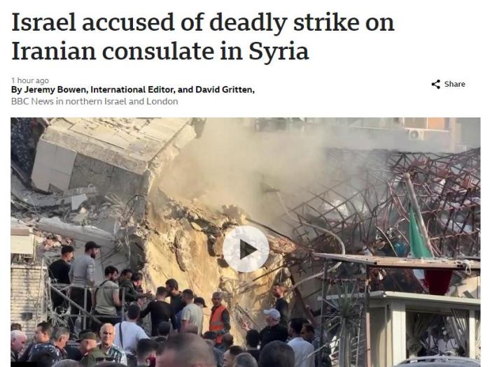 報(bào)道援引伊朗駐敘利亞大使侯賽因·阿克巴里的話(huà)稱(chēng),伊朗大使館旁邊的領(lǐng)事部門(mén)建筑“遭到以色列F-35戰(zhàn)機(jī)發(fā)射的六枚導(dǎo)彈襲擊”。伊朗媒體發(fā)布的視頻還顯示,現(xiàn)場(chǎng)遭到嚴(yán)重破壞,并起火冒煙。