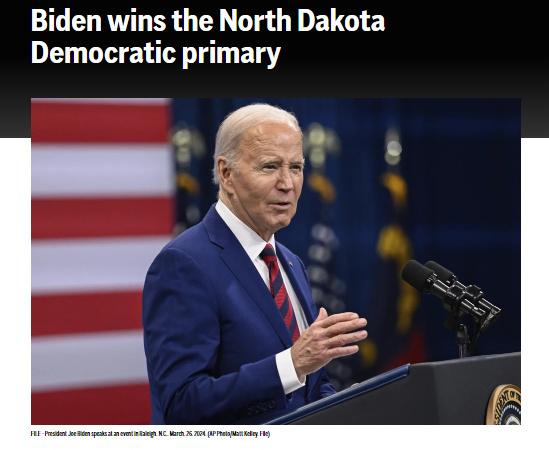 中新網(wǎng)3月31日電 據(jù)美聯(lián)社報(bào)道,當(dāng)?shù)貢r(shí)間30日,根據(jù)計(jì)票結(jié)果顯示,美國(guó)現(xiàn)總統(tǒng)拜登贏得2024年美國(guó)總統(tǒng)選舉北達(dá)科他州民主黨初選。