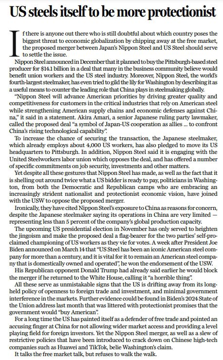 放眼當(dāng)今世界,一直在削弱自由市場(chǎng)、對(duì)經(jīng)濟(jì)全球化構(gòu)成最大威脅的究竟是哪個(gè)國(guó)家?如果仍然有人對(duì)此心存疑惑,那看看最近新日本制鐵公司(以下簡(jiǎn)稱新日鐵)計(jì)劃收購(gòu)美國(guó)鋼鐵公司的事件,或許就會(huì)有答案。