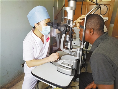 中國(guó)專家正在為貝寧當(dāng)?shù)鼗颊哌M(jìn)行眼科檢查。