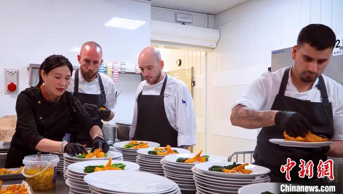 2024年2月22日,夏蓉(左)與巴塞羅那洲際酒店的廚師團(tuán)隊(duì)合作為宴會制作中餐。受訪者供圖