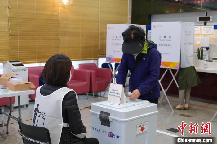 韓國第22屆國會議員選舉4月10日舉行,各政黨候選人將角逐國會300個(gè)議席。圖為首爾市廣津區(qū)一處投票站內(nèi),選民將選票投入票箱。中新社記者 劉旭 攝