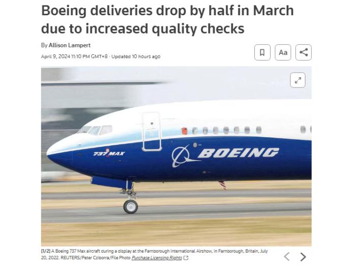 波音公司表示,2024年1月一架737 MAX 9噴氣式飛機發(fā)生事故后,該公司面臨更嚴(yán)格的安全審查。該公司將減少事故機型Max單通道噴氣式飛機的生產(chǎn)數(shù)量。