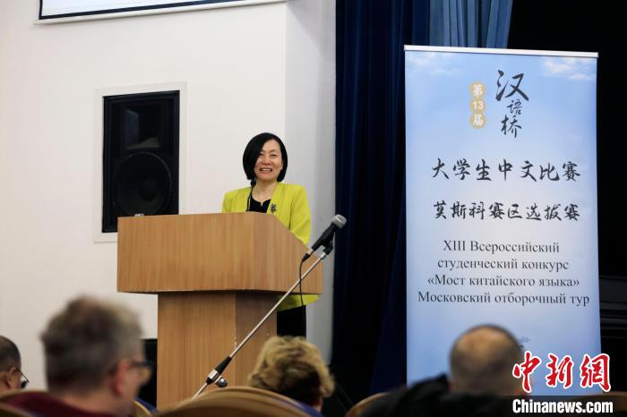 4月12日,中國(guó)駐俄使館教育處一等秘書鄧瀅出席第十三屆全俄“漢語(yǔ)橋”大學(xué)生中文比賽莫斯科賽區(qū)選拔賽并致辭。(中新網(wǎng)記者 田冰 攝)