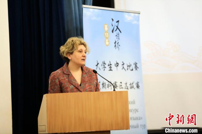 4月12日,莫斯科國(guó)立語(yǔ)言大學(xué)副校長(zhǎng)古謝茵諾娃出席第十三屆全俄“漢語(yǔ)橋”大學(xué)生中文比賽莫斯科賽區(qū)選拔賽并致辭。(中新網(wǎng)記者 田冰 攝)