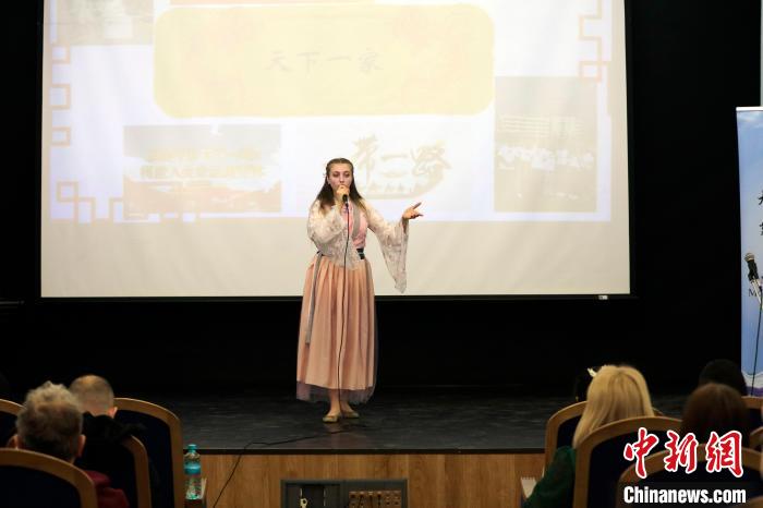 4月12日,第十三屆全俄“漢語(yǔ)橋”大學(xué)生中文比賽莫斯科賽區(qū)選拔賽在莫斯科國(guó)立語(yǔ)言大學(xué)舉行。圖為參賽選手進(jìn)行主題演講。(中新網(wǎng)記者 田冰 攝)
