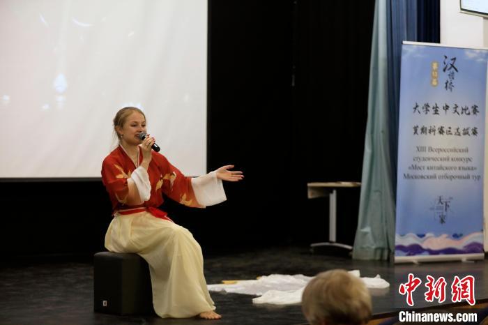 4月12日,第十三屆全俄“漢語(yǔ)橋”大學(xué)生中文比賽莫斯科賽區(qū)選拔賽在莫斯科國(guó)立語(yǔ)言大學(xué)舉行。圖為參賽選手在“中華文化技能”比賽環(huán)節(jié)。(中新網(wǎng)記者 田冰 攝)