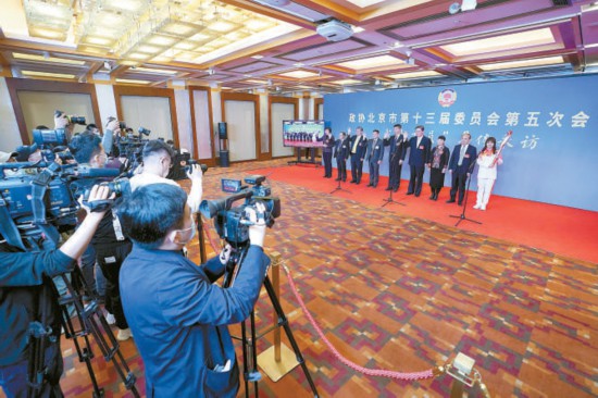 昨天,市政協(xié)十三屆五次會(huì)議舉辦“我是委員”集體采訪。8名委員在現(xiàn)場(chǎng),1名委員通過(guò)視頻圍繞“冬奧有我”“科創(chuàng)中心建設(shè)”“履職為民”三個(gè)主題回答記者提問(wèn)。 本報(bào)記者 方非攝