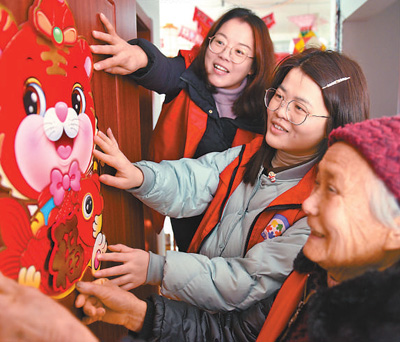 近日,安徽省當(dāng)涂縣五彩社會(huì)工作服務(wù)中心的志愿者與空巢老人一起貼年畫,為老人家增添節(jié)日喜慶氣氛。