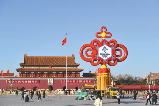 昨天,天安門廣場(chǎng)又添新景。一個(gè)鑲嵌有2022冬奧會(huì)會(huì)徽的巨型中國(guó)結(jié)正在安裝。中國(guó)結(jié)整體呈紅色,中心鑲嵌一片藍(lán)白相間的雪花,雪花正中是2022冬奧會(huì)會(huì)徽,為迎接春節(jié)和冬奧營(yíng)造喜慶氛圍。 本報(bào)記者 鄧偉攝
