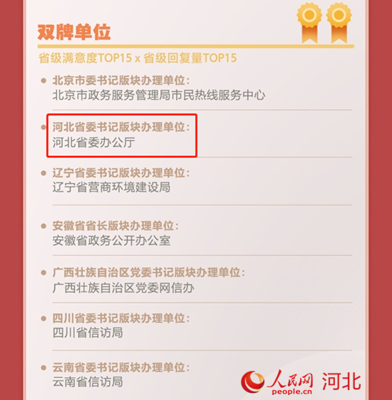 2021年,河北省委書記、省長(zhǎng)留言版塊辦理單位雙雙入圍“2021年度人民網(wǎng)網(wǎng)上群眾工作民心匯聚單位”省級(jí)滿意度top15榜單。