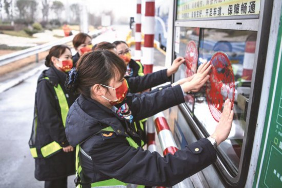 1月24日,在嘉興高速南湖收費站,南湖“紅船”巾幗服務(wù)隊的收費員們裝扮著收費站,向排隊等候取卡的駕駛員發(fā)放“?!弊帧⒎酪甙蛙囕d垃圾袋,送上一份暖暖的關(guān)愛。春節(jié)期間,收費員們將堅守崗位,用微笑服務(wù)春運,為高速公路暢通保駕護航。(王振宇)