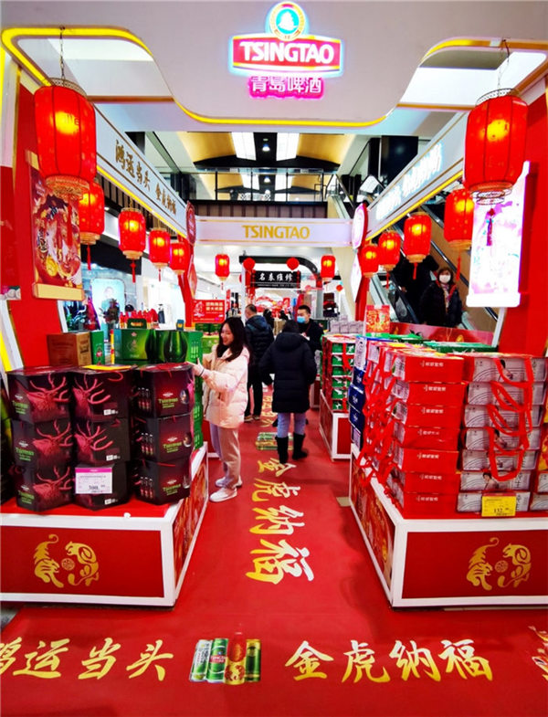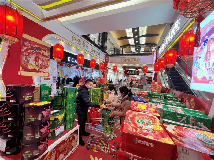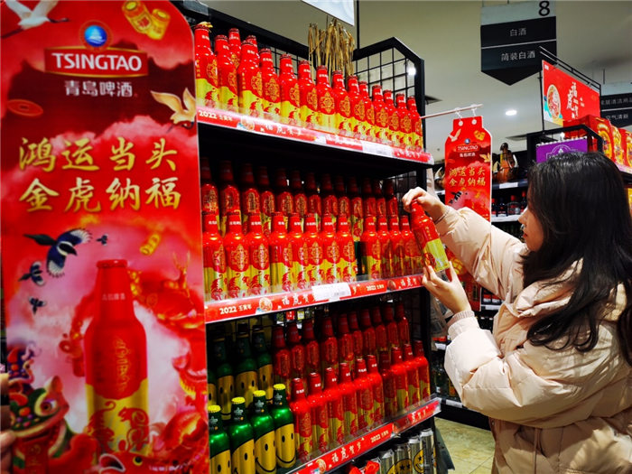 而青島啤酒“百年之旅“憑借獨一無二的珍惜原材、不惜工本的耗時慢釀、與無與倫比的琥珀原色和恒久回味,也在春節(jié)超高端市場上有叫好叫座?!比ツ曜咴L客戶就送的‘百年之旅’,有特色又有排面,客戶反饋特別好,今年特地團購一批,公司年會聚餐也喝他?!澳惩赓Q(mào)公司采購部的劉先生,正在和超市的經(jīng)理談大宗采購,作為青島”特產(chǎn)“的青島啤酒,是他們每年過年的首選禮品,”還有今年推出虎年版的百年鴻運,特別新年應(yīng)景,配上特有的搖擺蓋開起來特別有氣氛,喜慶。“