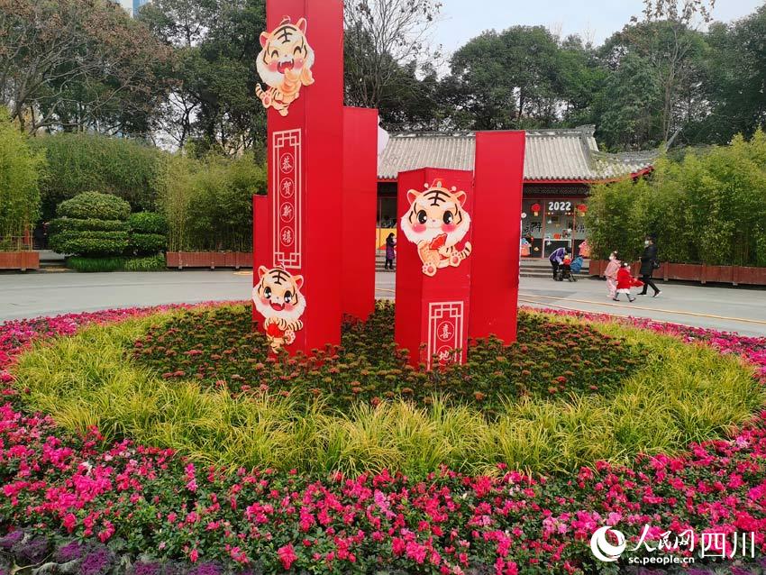 園內(nèi)的幾處空地上,布置了幾個花壇。上邊除了吉祥的紅黃色彩,還有可愛的動漫形象老虎圖案?!盎⒛昙椤薄敖鸹⒂骸薄靶履昕鞓愤^年好”……各種好彩頭的詞語,標示出歡度春節(jié)的主題,看了讓人精神為之一振。