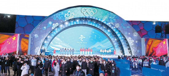 昨晚,北京頒獎廣場舉行北京冬奧會短道速滑混合團(tuán)體接力的頒獎儀式。 本報記者 劉平攝