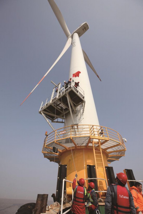 經(jīng)過一個多小時的航行,運輸船順利到達位于風(fēng)場最外圍的一臺風(fēng)機旁邊,一個個組裝好的設(shè)備“整裝待發(fā)”。在運輸船平穩(wěn)靠近風(fēng)機后,兩名做好防護措施的施工人員率先爬上梯子,到達第二層風(fēng)機平臺后,兩人迅速在護欄上固定好滑輪,與運輸船上的施工人員相互配合,將所有設(shè)備“運輸”到平臺上(見右圖 記者 江建華攝)。