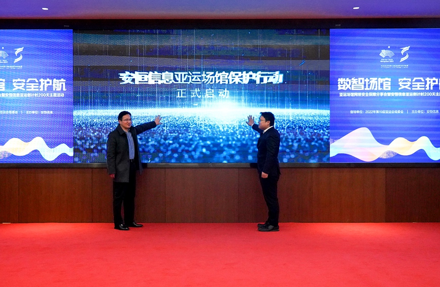 人民網(wǎng)杭州2月23日電 (張麗瑋)今天,杭州亞組委廣播電視和信息技術(shù)部副部長趙欣浩與安恒信息高級副總裁袁明坤共同啟動了“亞運(yùn)場館網(wǎng)絡(luò)安全保護(hù)行動”。
