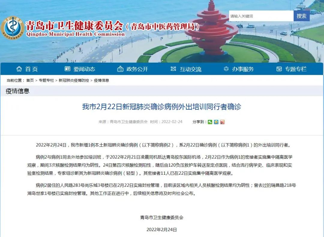 人民網(wǎng)青島2月24日電(鄭浦麗)據(jù)青島市衛(wèi)生健康委員會(huì)消息,2022年2月24日,青島市新增1例本土新冠肺炎確診病例(以下簡(jiǎn)稱病例2),系2月22日確診病例(以下簡(jiǎn)稱病例1)的外出培訓(xùn)同行者。