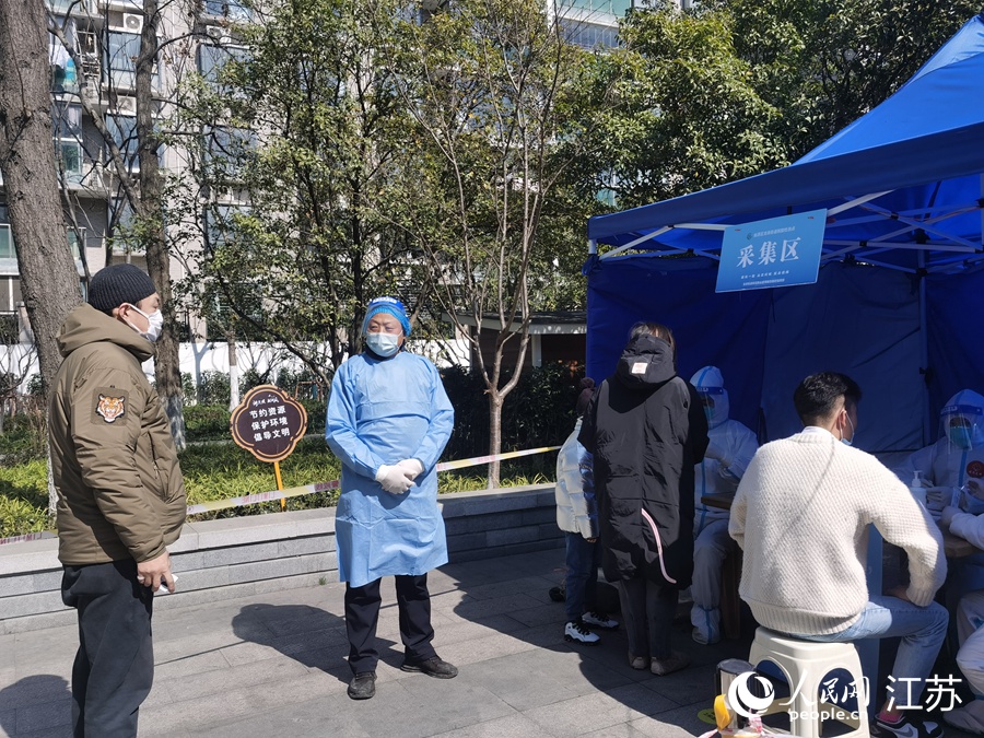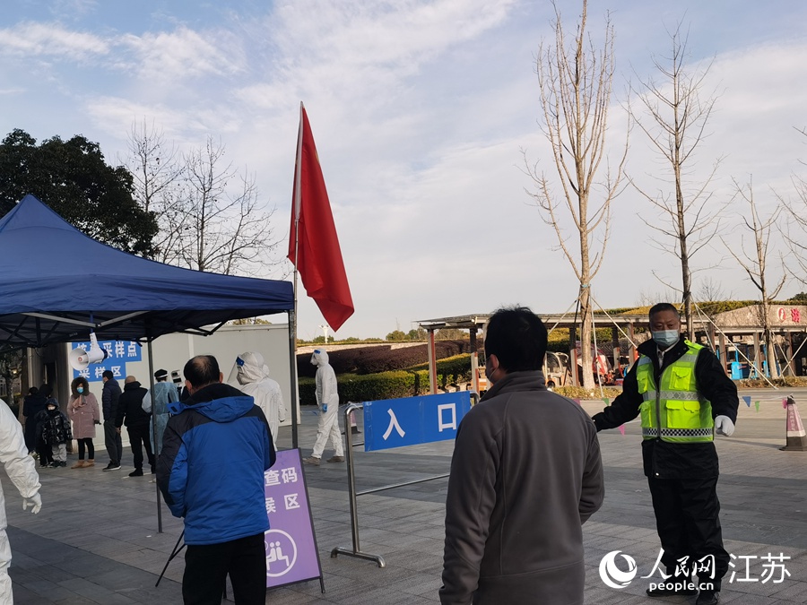 2月24日上午,在姑蘇區(qū)三香公園內(nèi),王新(中)在核酸檢測(cè)采樣點(diǎn)維持秩序。人民網(wǎng)記者 王繼亮攝