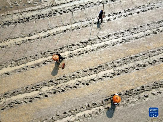 3月13日,在湖南省婁底市雙峰縣井字鎮(zhèn)花橋村,農(nóng)民在秧田勞作(無人機(jī)拍攝)。