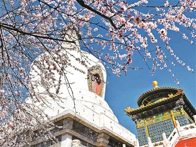 春暖大地,北海公園白塔旁的山桃花盛開(kāi),吸引不少游客前來(lái)欣賞。圖為昨日拍攝的盛開(kāi)的山桃花掩映著的北海公園白塔。