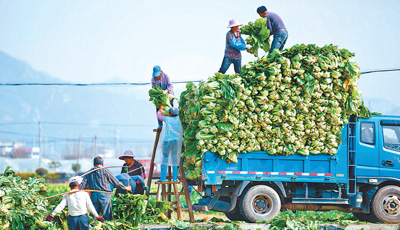 3月16日,浙江省溫嶺市石橋頭鎮(zhèn)沙角村,農(nóng)戶(hù)正忙著收割、裝運(yùn)油芥菜。隨著春耕備耕在即,農(nóng)戶(hù)及時(shí)搶收早春蔬菜,騰空農(nóng)田種植早稻。