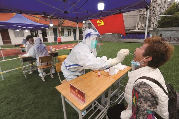 本周末,南京市抓緊開展規(guī)模性核酸檢測。圖為3月19日,在南京鼓樓區(qū)小市新村社區(qū)核酸檢測點(diǎn),市民正接受核酸檢測取樣。 本報(bào)記者 陳儼 攝