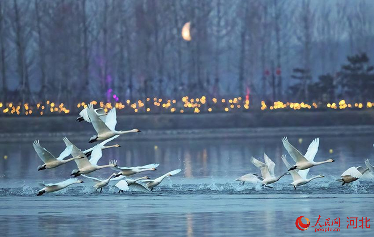 河北省石家莊市滹沱河葉子廣場東側的水面上,數百只白色的精靈小天鵝在這里嬉戲。 劉洵攝