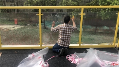 該座天橋大約有三分之一的玻璃護(hù)欄已經(jīng)貼上了膜。未貼膜的玻璃護(hù)欄有的橫著拉了兩條“警戒線”,有的拉了三條。“要不了多久就能貼完了”,現(xiàn)場工作人員表示,“警戒線”是臨時(shí)措施,貼完膜就會(huì)取掉。