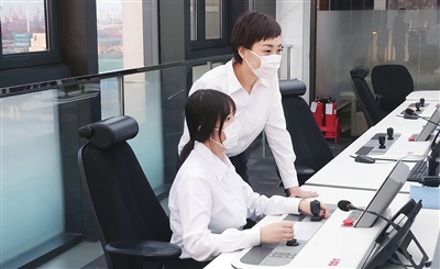 在天津港集裝箱碼頭遠程操控中心,軌道橋女司機丁亞楠(后)正指導(dǎo)同事遠程操控。(天津港集團供圖)