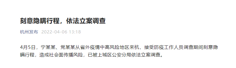 人民網(wǎng)杭州4月6日電 (艾宇韜)據(jù)杭州市新冠肺炎疫情防控指揮部最新消息,4月5日,兩名從省外疫情中高風險地區(qū)來杭人員寧某某、黨某某,在接受杭州防疫工作人員調(diào)查期間刻意隱瞞行程,造成社會面?zhèn)鞑ワL險,目前已被杭州市上城區(qū)公安分局依法立案調(diào)查。