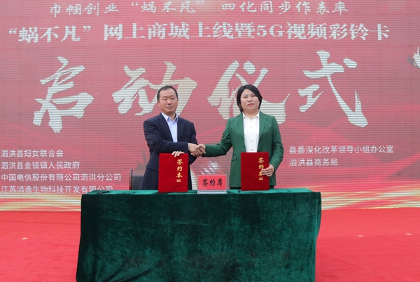 近日,江蘇省泗洪縣婦聯(lián)、改革辦、商務(wù)局、金鎖鎮(zhèn)人民政府和電信公司聯(lián)合舉辦“巾幗創(chuàng)業(yè)‘蝸不凡’,‘四化’同步作表率”現(xiàn)場活動,助力鄉(xiāng)村企業(yè)數(shù)字化復(fù)工復(fù)產(chǎn)。“蝸不凡”網(wǎng)上商城正式上線,5G視頻彩鈴卡同步啟動,電信公司和“蝸不凡”品牌企業(yè)簽訂了“云改數(shù)轉(zhuǎn)”合作協(xié)議。