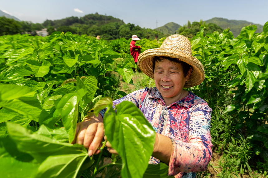在澧田鎮(zhèn)雙江村蠶桑基地,蠶農在采摘桑葉。朱國朝攝