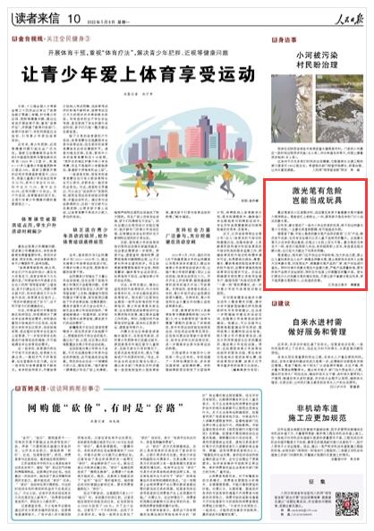 人民日報刊發(fā)連云港讀者來信:激光筆有危險 豈能當成玩具