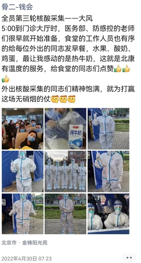 4月30日是五一小長假第一天,晚7點,宣武醫(yī)院神經內科電生理專業(yè)組工作群的消息突然響了,組長黃朝陽發(fā)布了一條信息:“5月1日和3日各需5人支援西城核酸采樣任務,請大家積極響應,積極報名!”看到醫(yī)院緊急通知,同事們用無聲、快速地接龍做出了回應,名額很快報滿,很多沒報上的同事還主動要求成為候補。