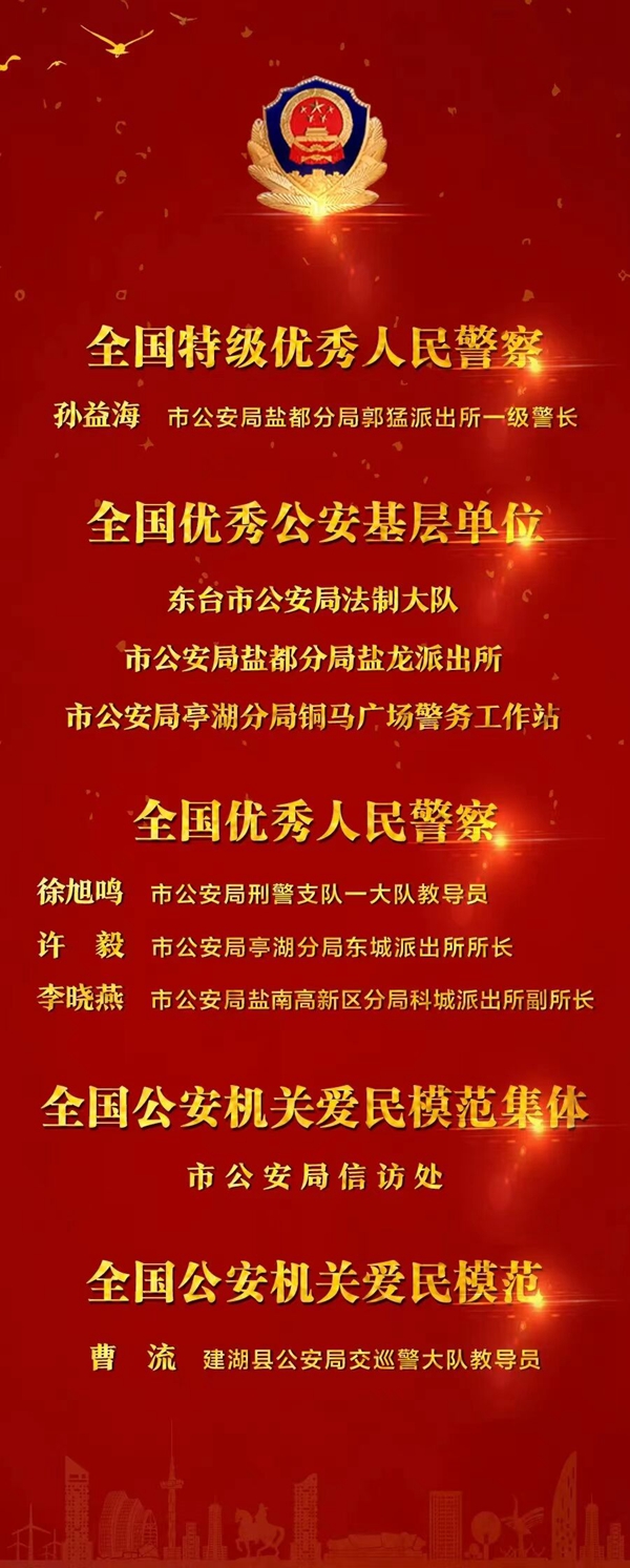 5月25日,全國(guó)公安系統(tǒng)英雄模范立功集體表彰大會(huì)上,江蘇鹽城公安1位民警被授予“全國(guó)特級(jí)優(yōu)秀人民警察”稱號(hào)、3個(gè)集體獲評(píng)“全國(guó)優(yōu)秀公安基層單位”、3名民警獲評(píng)“全國(guó)優(yōu)秀人民警察”,1個(gè)集體獲評(píng)“全國(guó)公安機(jī)關(guān)愛民模范集體”、1名民警獲評(píng)“全國(guó)公安機(jī)關(guān)愛民模范”。