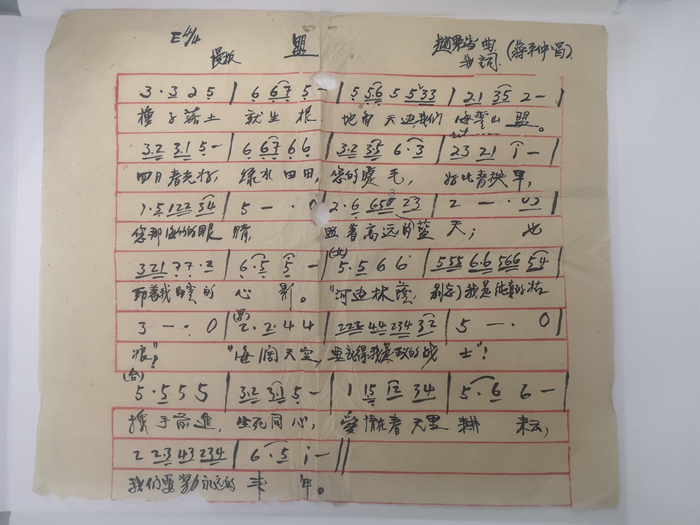 “種子落土就生根,地角天邊,我們就海誓山盟”“海闊天空,要記得我是正義的戰(zhàn)士”“攜手前進(jìn),生死同心,愛情在春天里耕耘”……一張泛黃的稿紙上寫滿了革命激情。這是二十世紀(jì)三四十年代,由趙良璋和薛介民兩位烈士共同創(chuàng)作的革命歌曲《盟》。去年3月1日,薛介民的后人將這份珍貴的手稿捐贈給了雨花臺烈士紀(jì)念館。