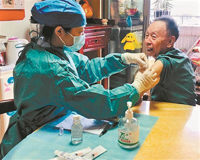 當(dāng)天上午,86歲高齡的黃俊英精神矍鑠,圍繞著粵語(yǔ)相聲聊得起勁。一旁的醫(yī)護(hù)人員嚴(yán)格按照接種流程,對(duì)他的身體健康狀況進(jìn)行綜合檢查和認(rèn)真評(píng)估,確認(rèn)其健康狀況穩(wěn)定、無(wú)相關(guān)禁忌癥,并征得其同意后,為其接種疫苗。