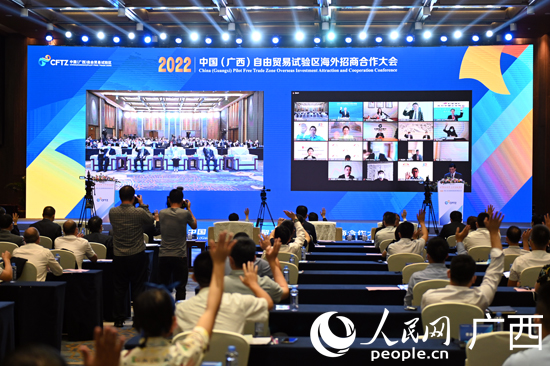 人民網南寧5月27日電 (記者彭遠賀)5月27日下午,2022中國(廣西)自由貿易試驗區(qū)海外招商合作大會在南寧舉行。大會以“自貿聯(lián)動世界,合作共繪藍圖”為主題,采用線上、線下結合方式,在北京和南寧同步設置主會場,在新加坡、馬來西亞、日本、韓國、德國、美國等國家或地區(qū)設置分會場,向全球展現(xiàn)廣西自貿試驗區(qū)經濟活力、創(chuàng)新動力和投資潛力,吸引全球優(yōu)質資源匯聚,共商共享合作機遇,共譜合作新篇章。