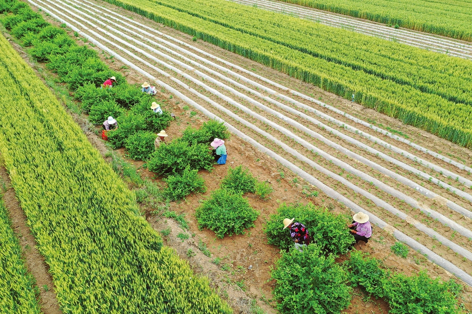 5月27日,新絳縣澤掌鎮(zhèn)吳嶺莊村,村民在采摘金銀花。連日來,當(dāng)?shù)剞r(nóng)民抓緊晴好天氣,加強(qiáng)對頭茬早熟玉米、辣椒、大蔥、中藥等進(jìn)行田間管理。(高新生攝)
