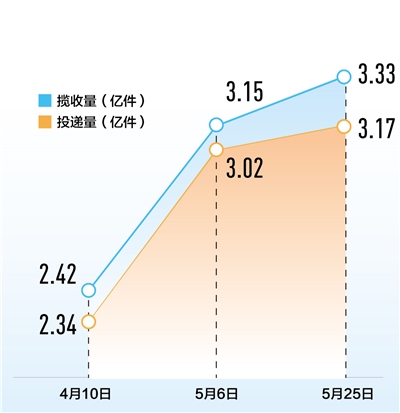 4月10日以來(lái),各地各部門多措并舉保通保暢,全國(guó)停運(yùn)的郵政快遞分撥中心和郵件快件積壓數(shù)均大幅下降。5月6日,全國(guó)郵件快件攬收、投遞量均恢復(fù)至3億件以上;5月28日,郵件快件攬收量約為3.14億件,投遞量約為3.22億件,均超過去年同期水平。