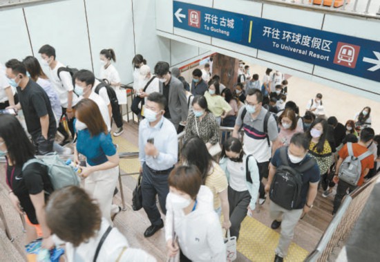 昨天早上八點半左右,地鐵國貿(mào)站呈現(xiàn)早高峰趨勢。 本報記者 劉平攝