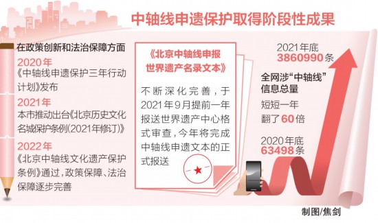 2017年,“積極推進(jìn)中軸線申遺工作”寫入《北京城市總體規(guī)劃(2016年—2035年)》。同年,北京市推進(jìn)全國文化中心建設(shè)領(lǐng)導(dǎo)小組批準(zhǔn)成立了中軸線申遺保護(hù)專項(xiàng)工作組,全面啟動(dòng)北京中軸線申遺保護(hù)工作……