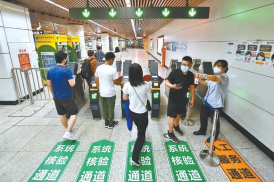 昨天,在地鐵十里河站,乘客從恢復(fù)開放的出入口進出站,工作人員在閘機位置幫助還沒升級一卡通的乘客進行升級。 本報記者 鄧偉攝