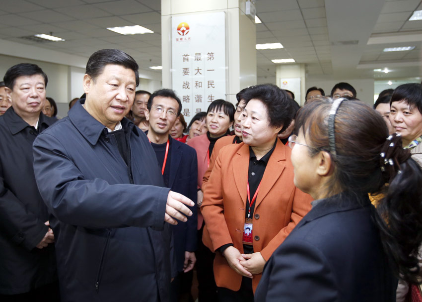 2013年11月27日下午,中共中央總書記、國(guó)家主席、中央軍委主席習(xí)近平在濟(jì)南市外來務(wù)工人員綜合服務(wù)中心同從事家政服務(wù)的“陽光大姐”交流。新華社記者鞠鵬攝