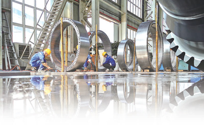 在中國船舶重慶齒輪箱有限責任公司,工人們正對風力發(fā)電機內(nèi)齒圈進行清洗及外觀檢查。