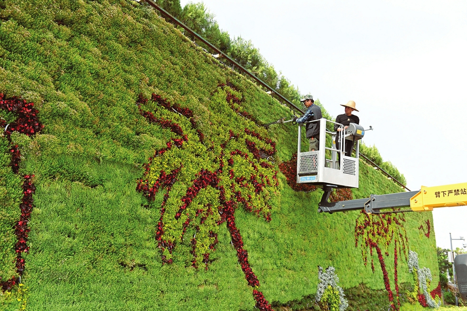 6月9日,太原植物園內(nèi),園藝師在一面布滿綠植的墻面上修剪出一幅美麗的畫卷。太原植物園開(kāi)放以來(lái),以優(yōu)美的原生態(tài)綠色景觀吸引了大批游客,成為省城綠色生態(tài)“打卡地”。(記者阮洋攝)