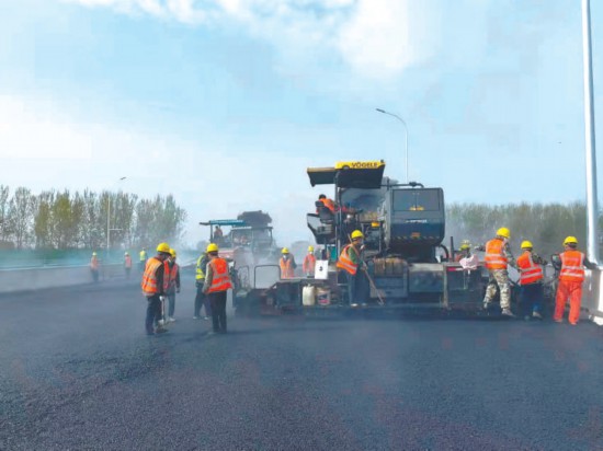 京雄高速六環(huán)至市界段路面鋪油施工現(xiàn)場。