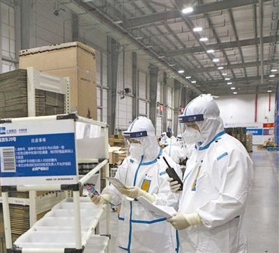 因為進口藥品的物流是冷鏈物流,按照嚴(yán)格的衛(wèi)生要求,我們換上白色防護服,戴上防護面屏、一次性手套、N95口罩,經(jīng)過掃碼、測溫,一起進入了保稅倉。